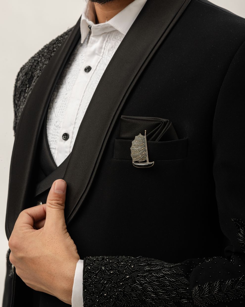 A nod to the elegance of 1920s maritime design, the Art Deco Sail Brooch is a unique sculptural accessory. This piece features a curved, polished black onyx mast alongside a fan-shaped sail intricately pavé-set with shimmering marcasite. It’s a sophisticated way to add texture and a sense of movement to any outfit.