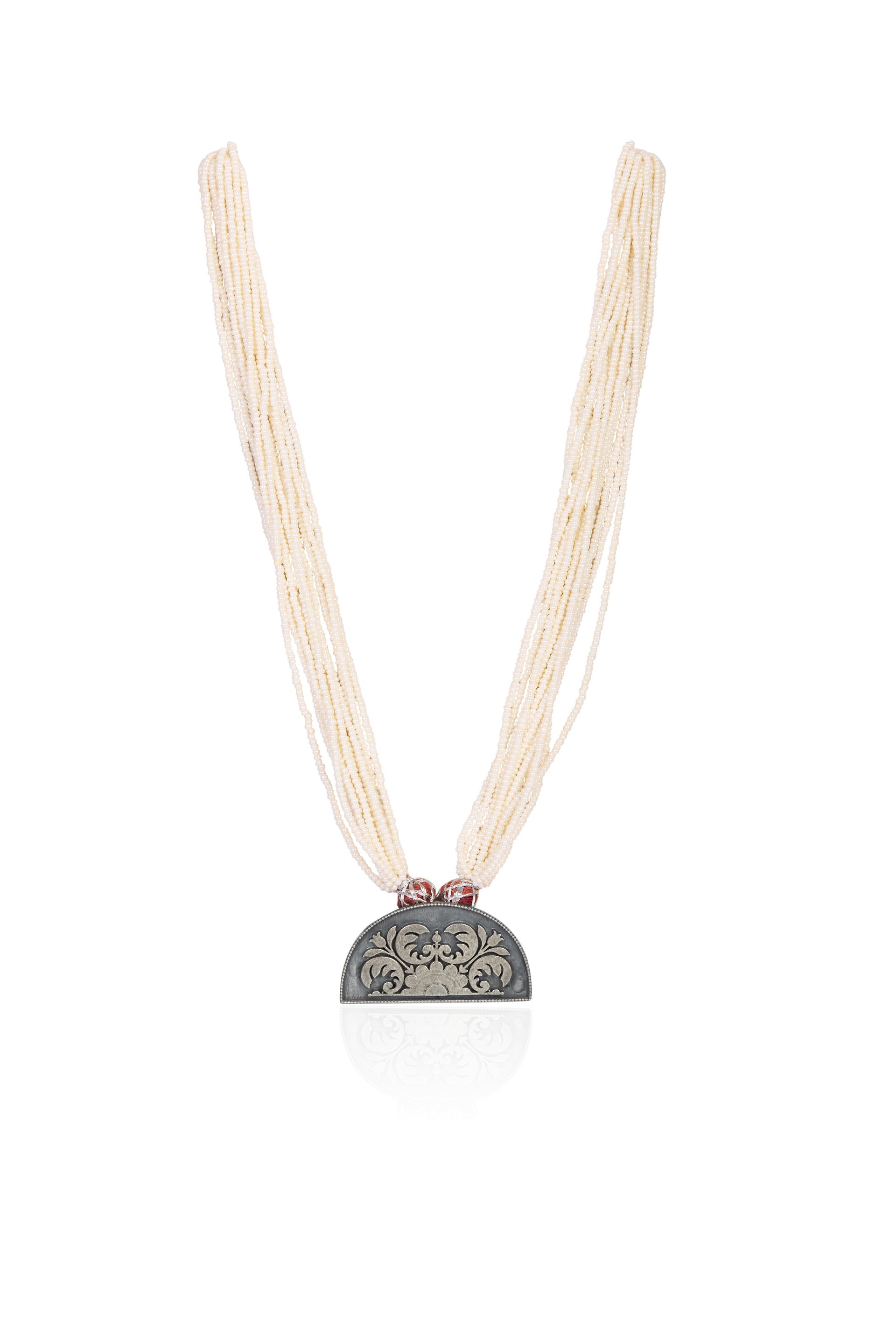 Delicate Silver Necklace with Oxidized Fan Pendant, Bird Motifs, and Pearl Strands