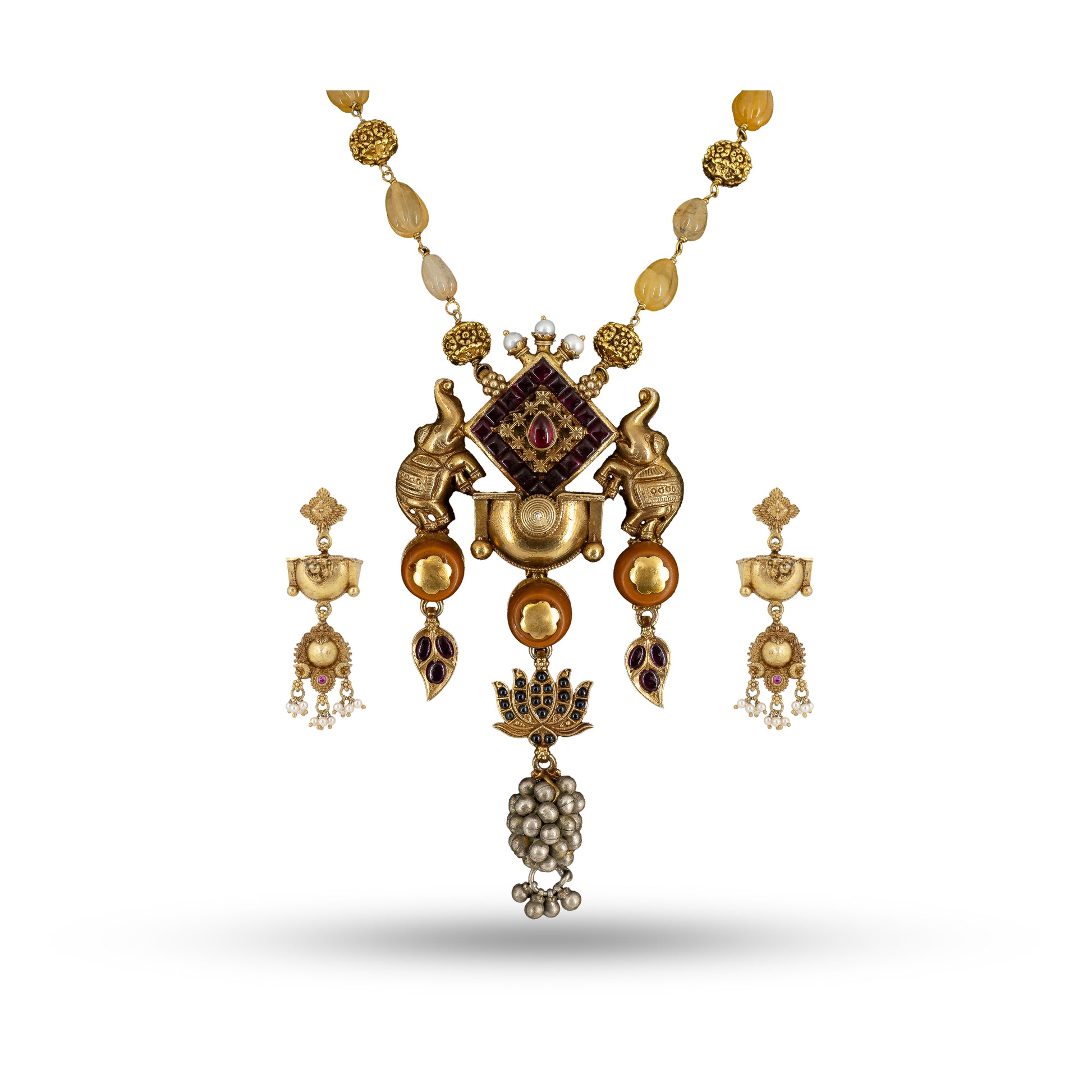 Gold Elephant Pendant 925 silver Bead Necklace Set