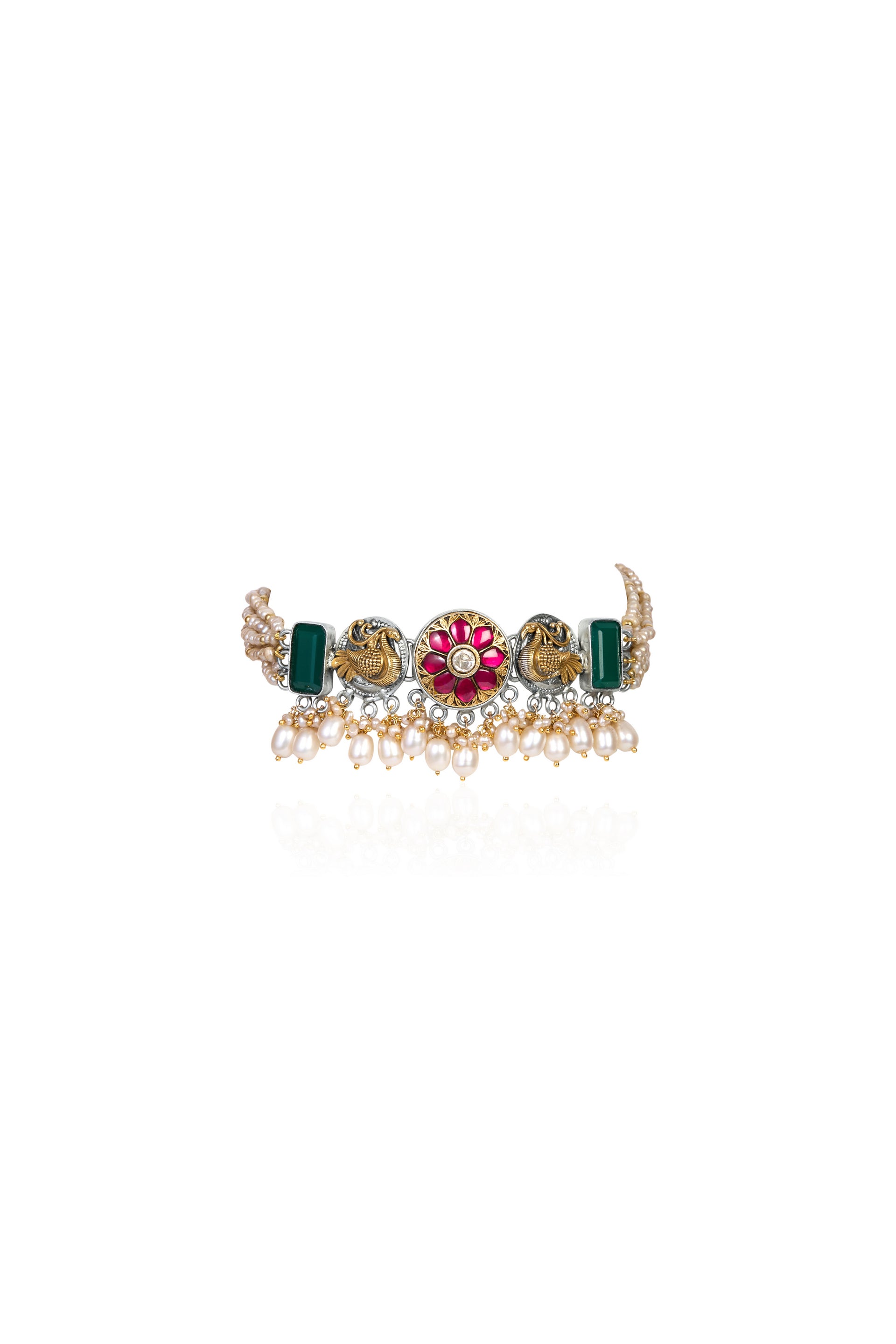 Oxidized Silver and Gold Choker with Peacock Motifs, Emeralds, Rubies, Pearls, and Kundan Style