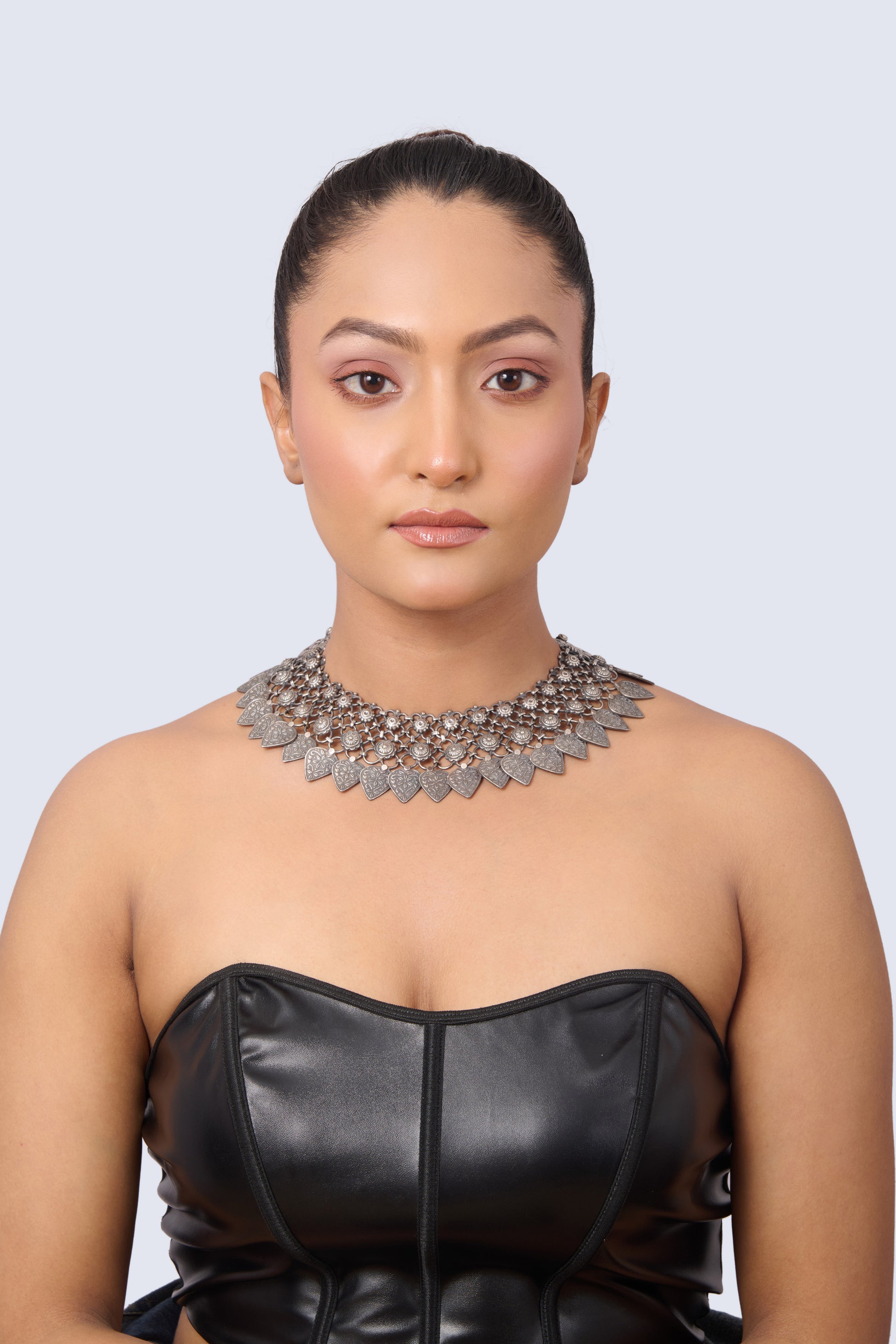 Oxidized Silver Choker with Intricate Mesh Design and Dangling Heart Pendants