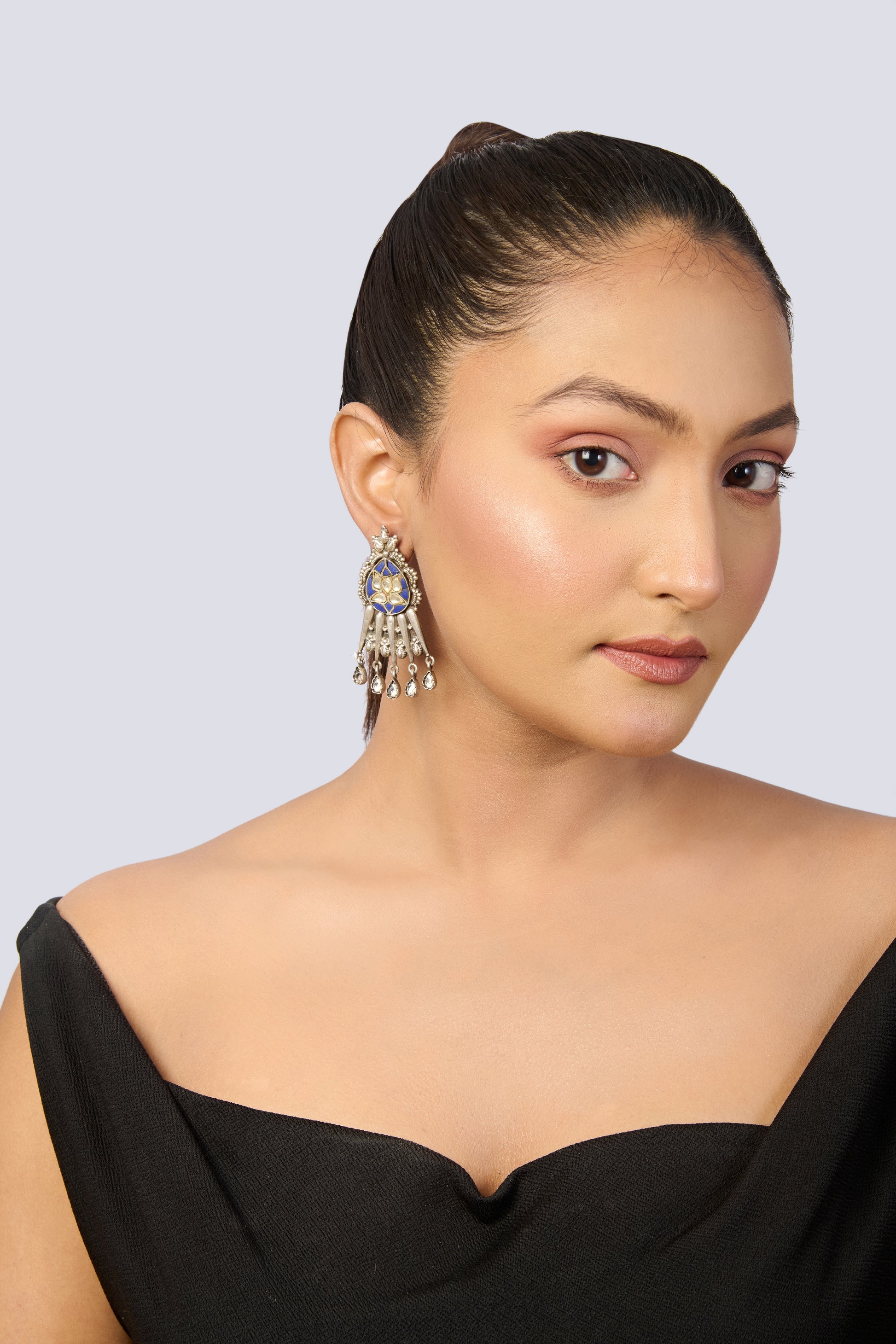 Oxidized Silver Dangle Earrings with Blue Enamel, Champagne Gems, and Smoky Quartz Drops