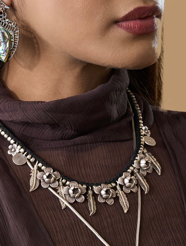 Oxidized Silver Floral & Feather Charm Necklace