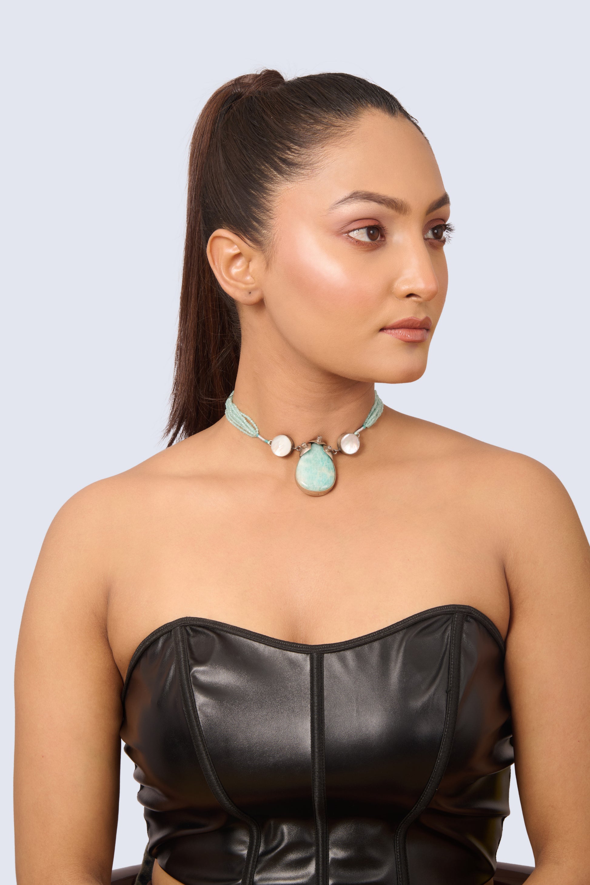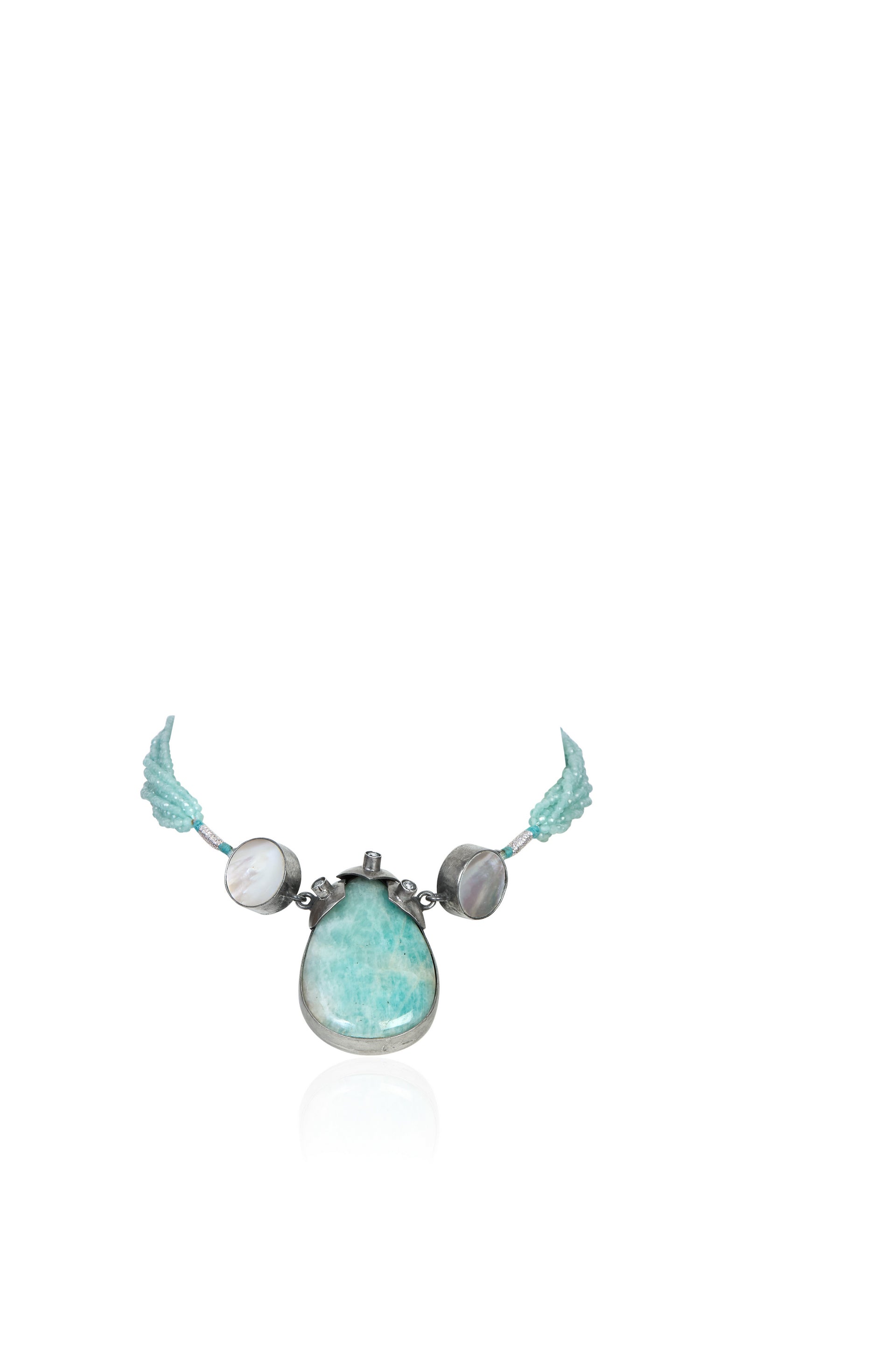 Silver Tone Necklace with Teardrop Amazonite Pendant, Carved Blue-Green Elements, and Moonstones